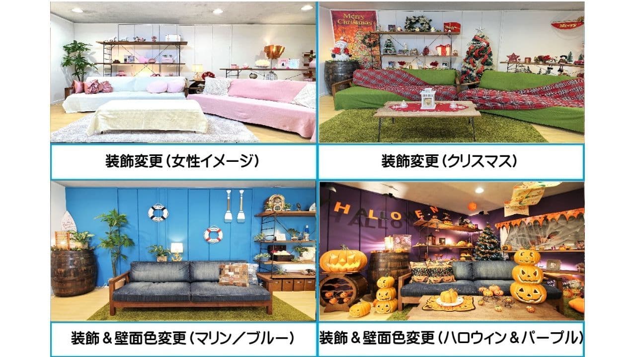 通常は『グリーンやオシャレなインテリア』を組み合わせた装飾で飾りこんでいるスタジオですが、4つの装飾『女性イメージ/マリン/ハロウィン/クリスマス』に変更し撮影が頂けるプランとなります。